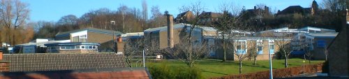 The design consists of a number of multi-sided buildings which can be seen using Google Maps by clicking on the image. The larger blocks in the middel form the two school halls. An additional classroom was added in 2006.